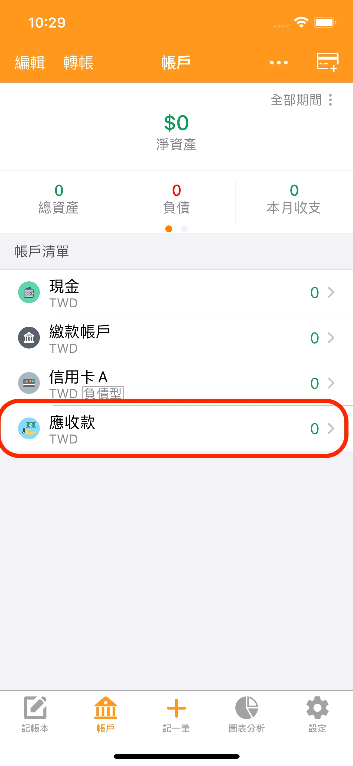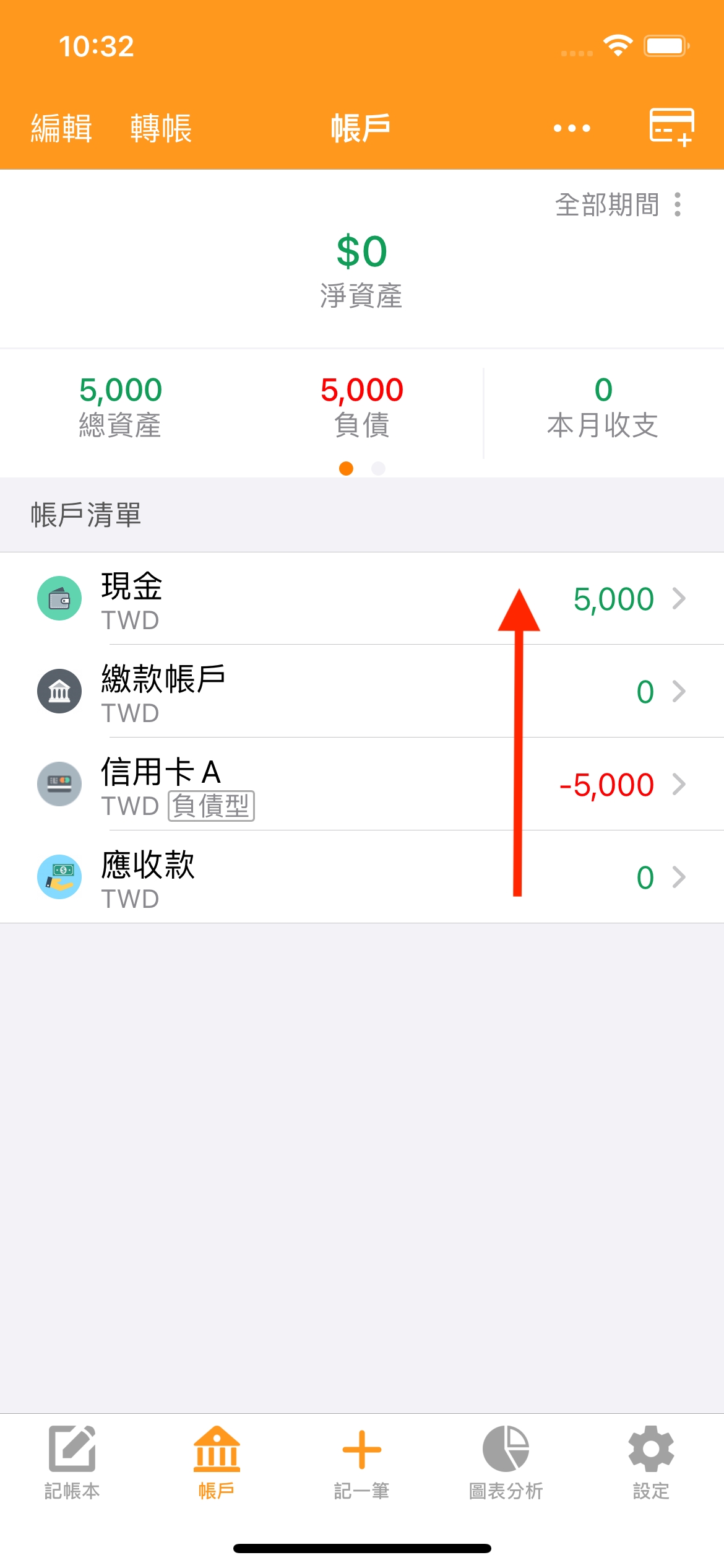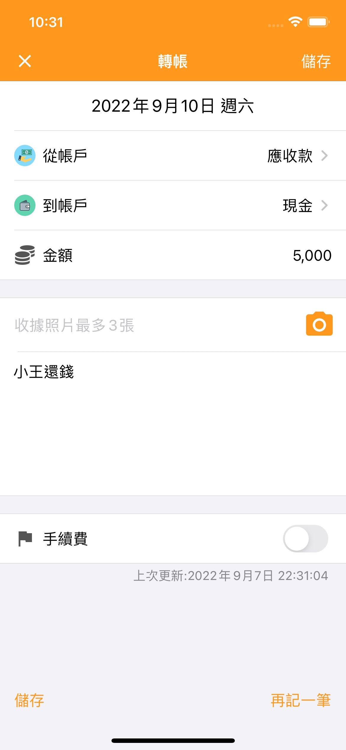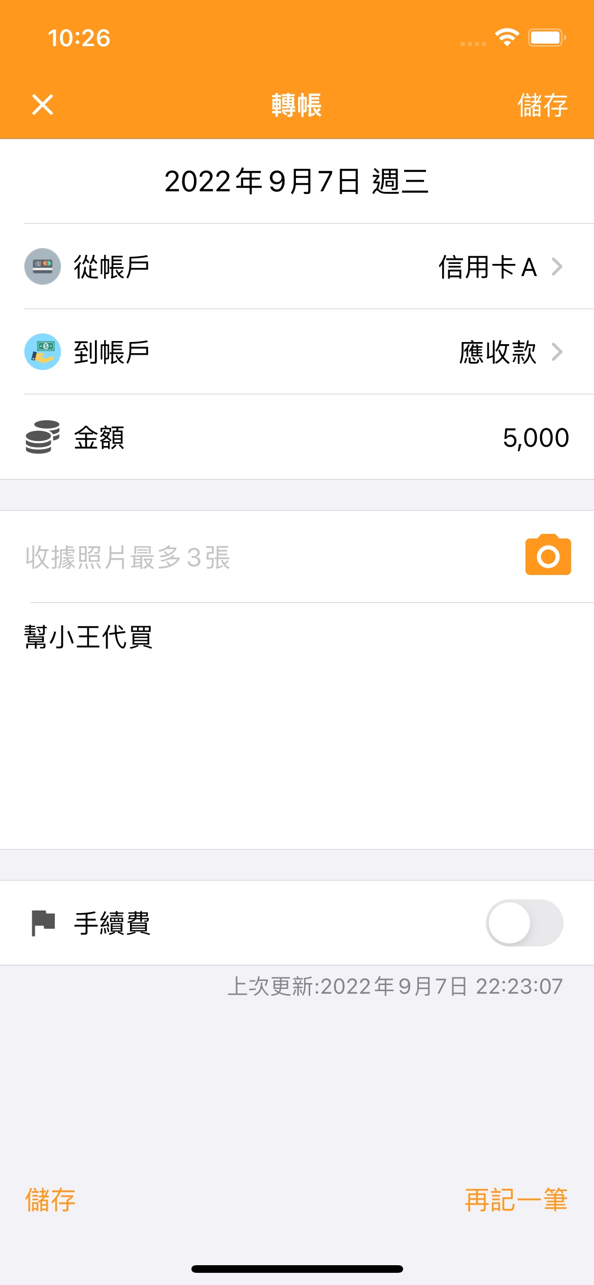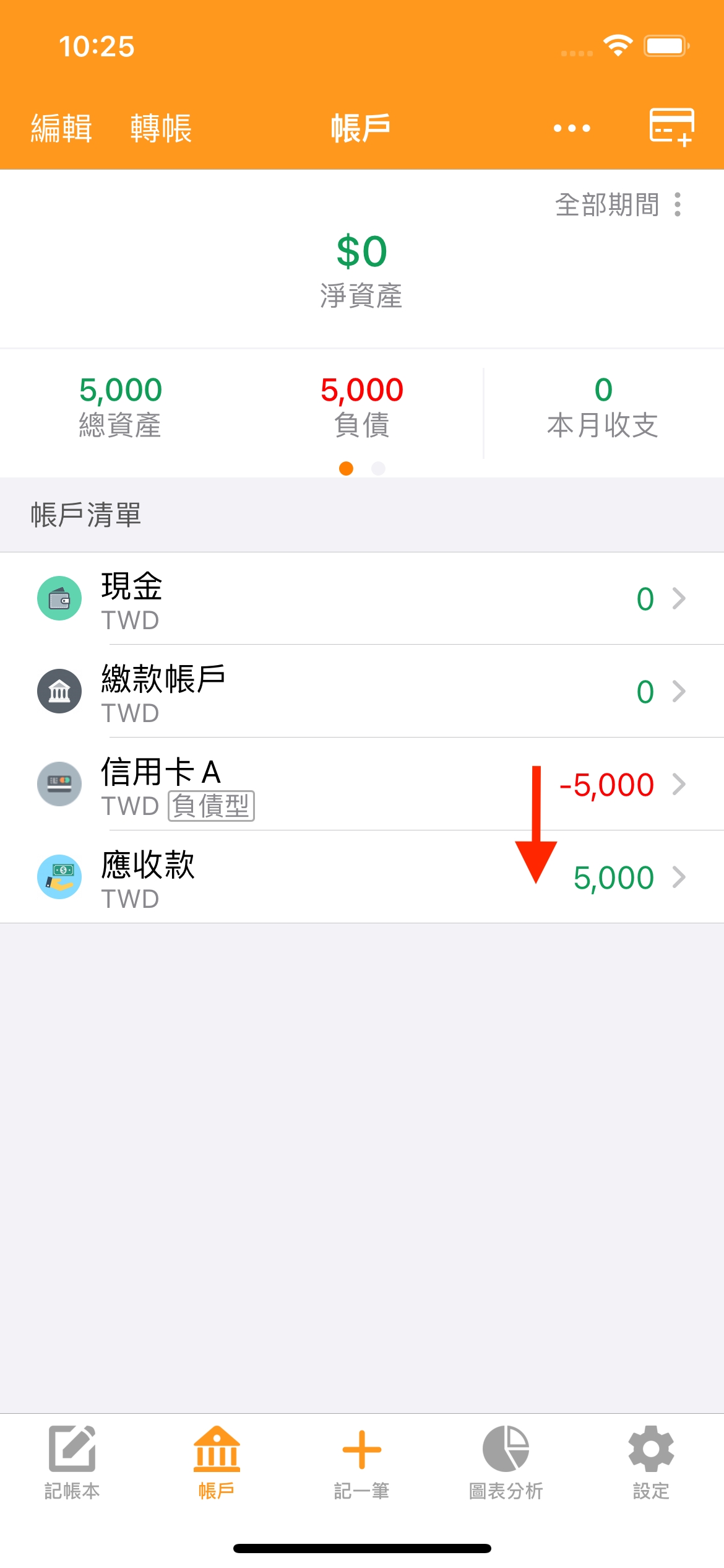 2.记一笔转帐,从【信用卡A】划5,000元给【应收款】这个帐户