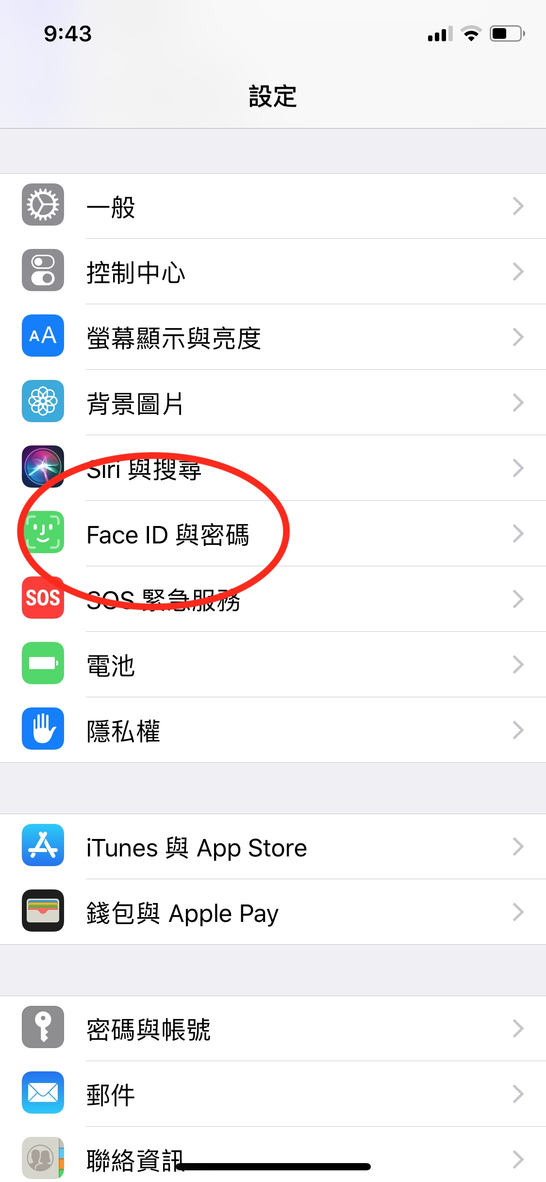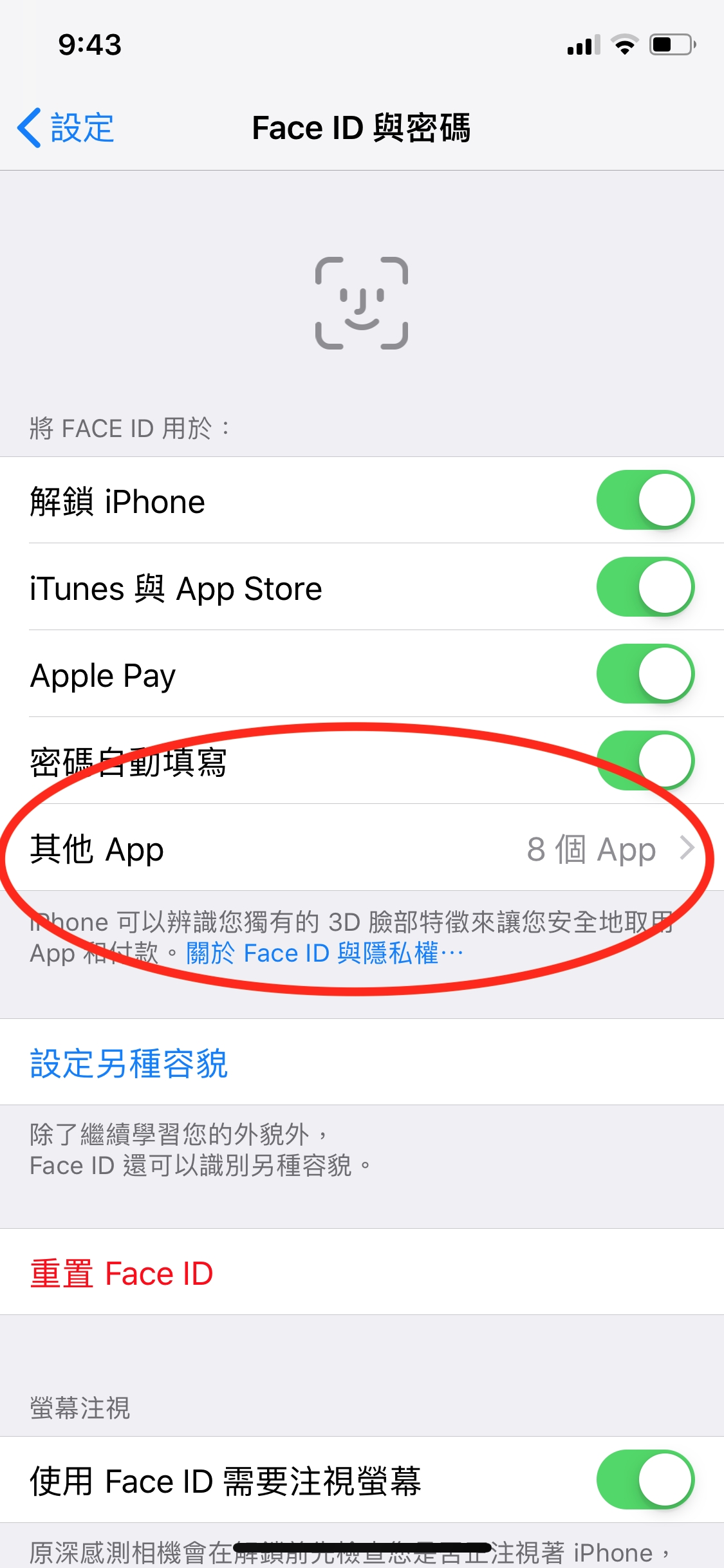 若要檢查 Face ID 設定,請前往「設定」>「Face ID 與密碼」。確認已設定 Face ID,而且您想嘗試搭配 Face ID 使用的功能已開啟。