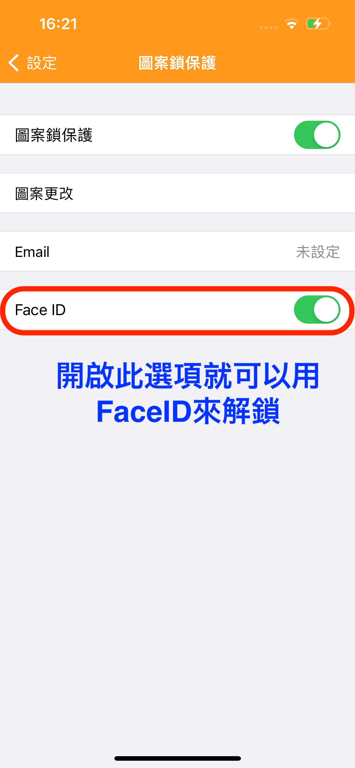 天天记账目前有提供图案锁(Pattern Lock),也可以用FaceID等生物辨识锁。
