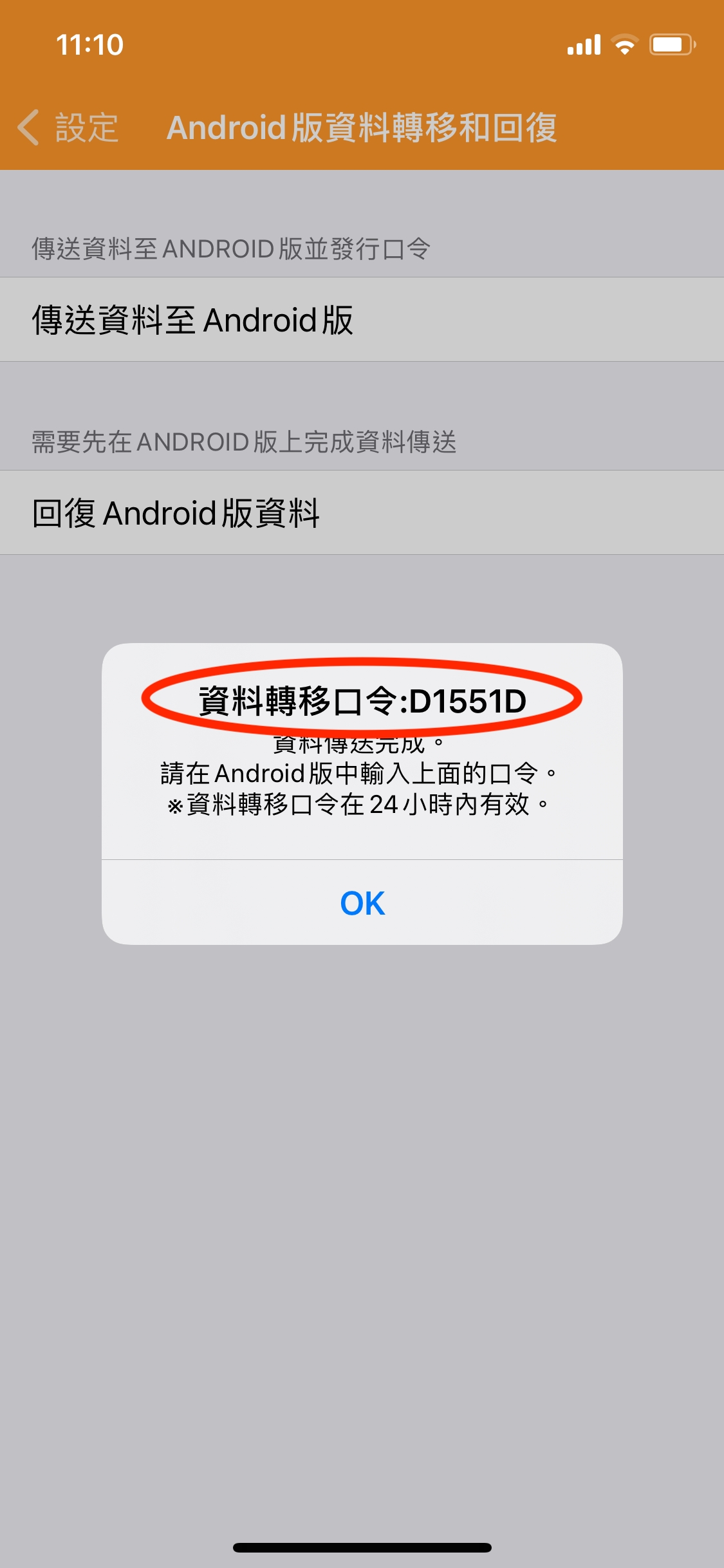传送完成后,会显示一个数据迁移口令,记下这个号码